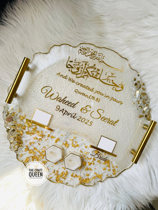 Custom Islamic Wedding Ring Tray – Personalized Nikkah Ring Holder with Quran Verse and Gold Detailing