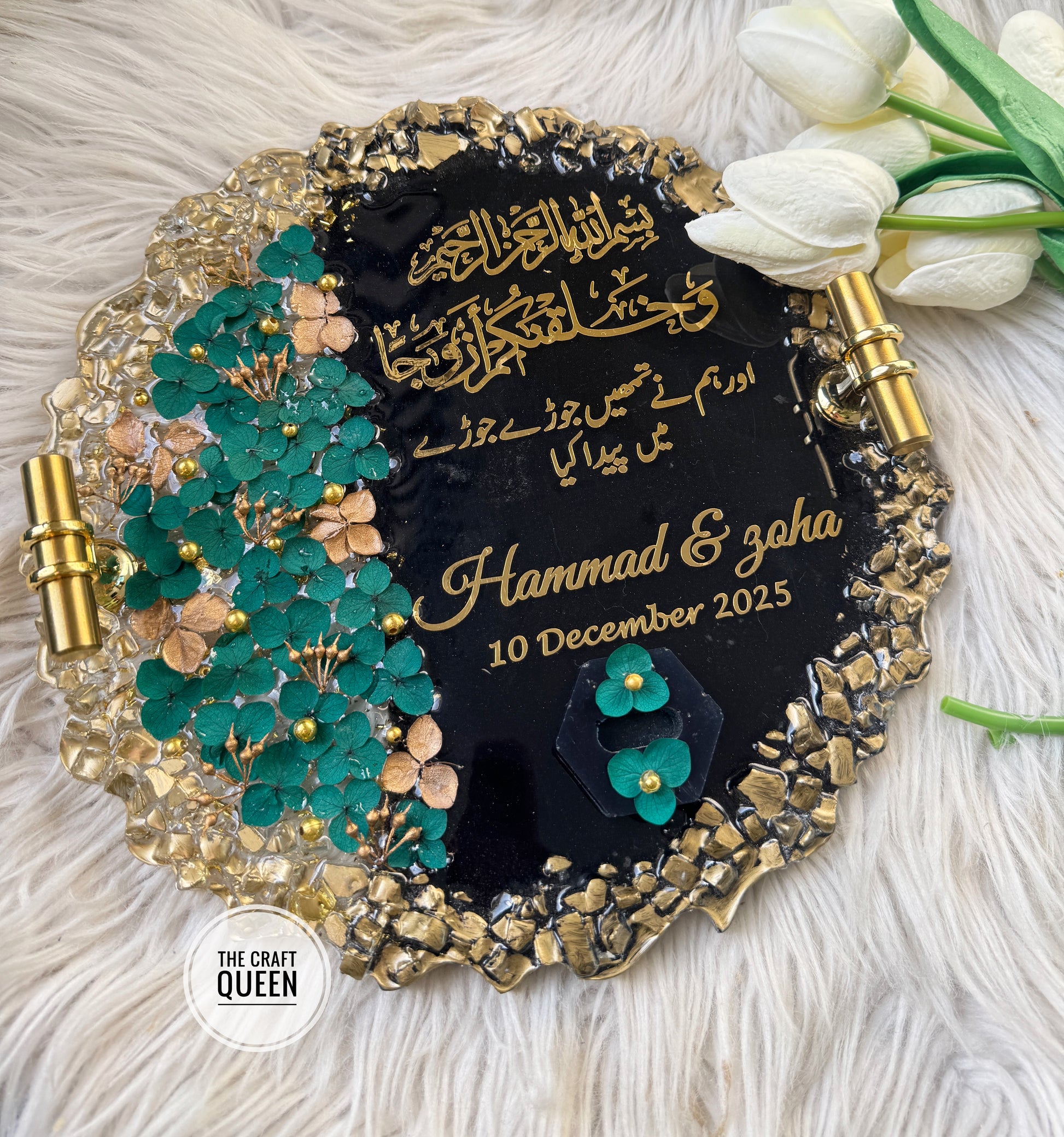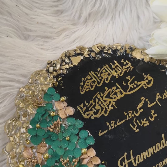 Mark a sacred beginning with this luxury black & gold personalized Islamic resin décor, handcrafted with deep black resin, preserved emerald-toned florals, and rich gold accents. Designed to reflect elegance and spirituality, this piece features a beautiful Quranic verse, along with customized couple names and event date.