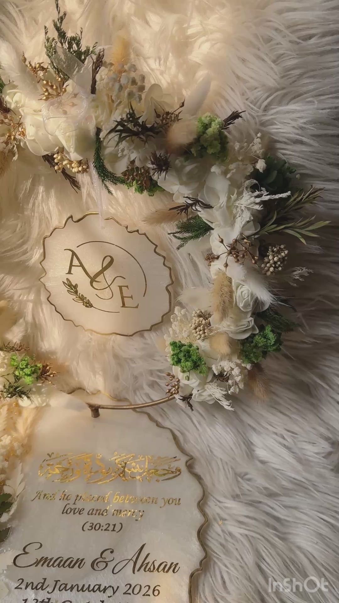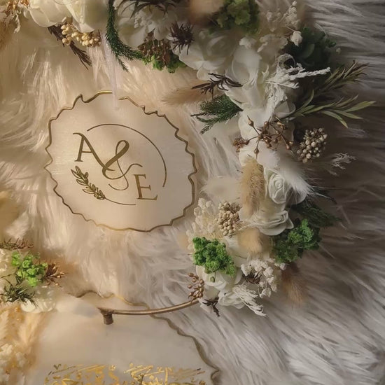 Preserve your sacred Nikah moments with this luxury handmade customized resin plaque set, thoughtfully designed with an elegant floral wreath frame and a matching personalized plaque. Adorned with dried florals, soft neutral tones, and premium gold detailing, this piece beautifully reflects love, faith, and elegance.