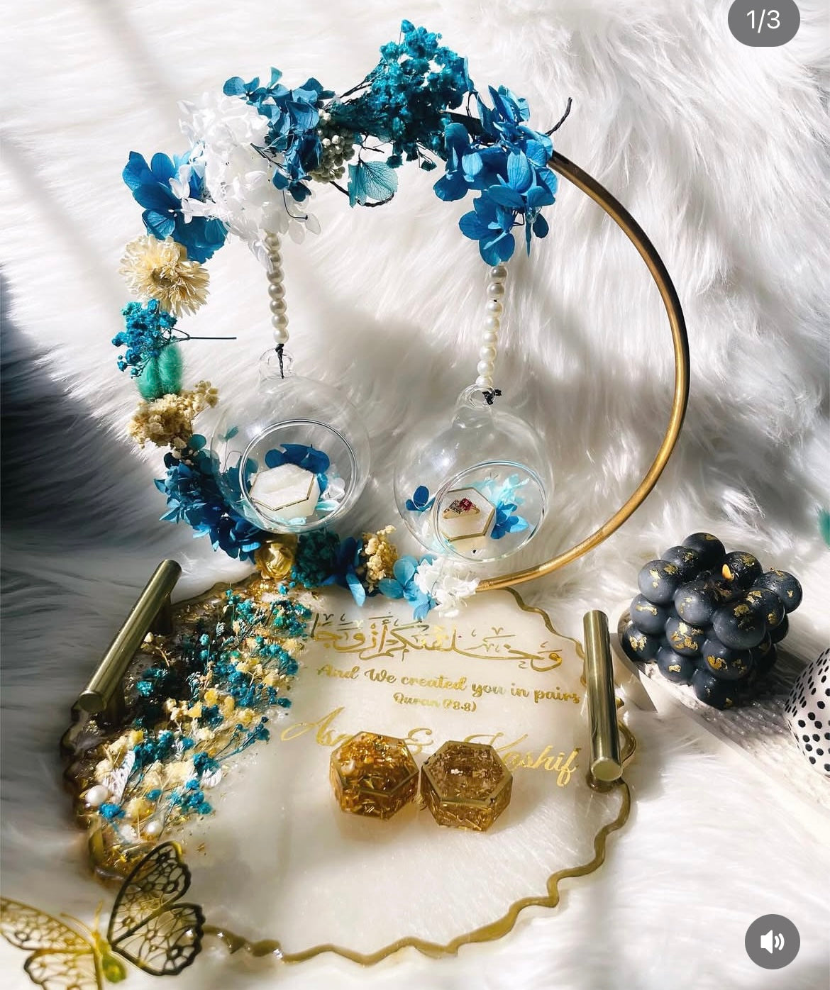 Make your special day unforgettable with our Handmade Luxury Resin Nikkah & Engagement Tray, designed with elegant blue preserved flowers, golden accents, and two glass hanging ring globes.