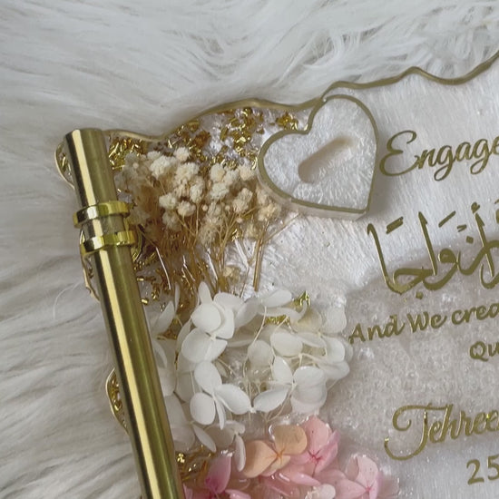 Make your engagement day even more special with this elegant personalized ring platter, designed with a white resin base and golden edges, beautifully accented with dried flowers in white and blush pink tones. The tray features a Quranic verse in gold calligraphy, along with the couple’s names and engagement date for a personal touch.