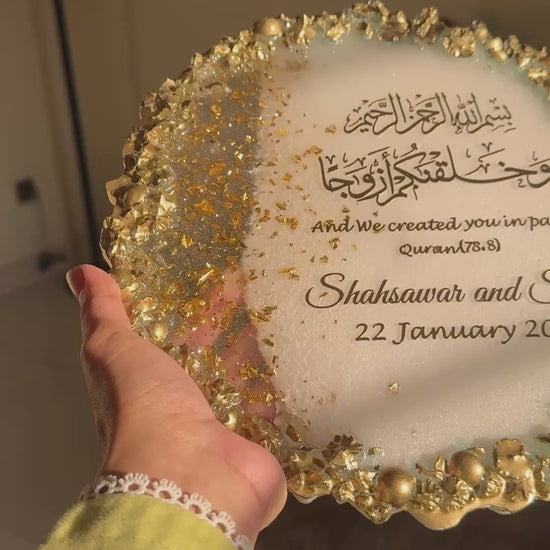 Our Luxury Islamic Nikah Resin Platter is handcrafted with premium resin, featuring exquisite Arabic calligraphy, Quranic verse, and customized couple details.