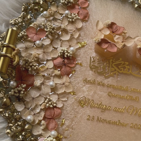 Celebrate a sacred union with this luxury handcrafted Islamic resin décor, beautifully designed with preserved flowers, pearl accents, and elegant gold detailing.
